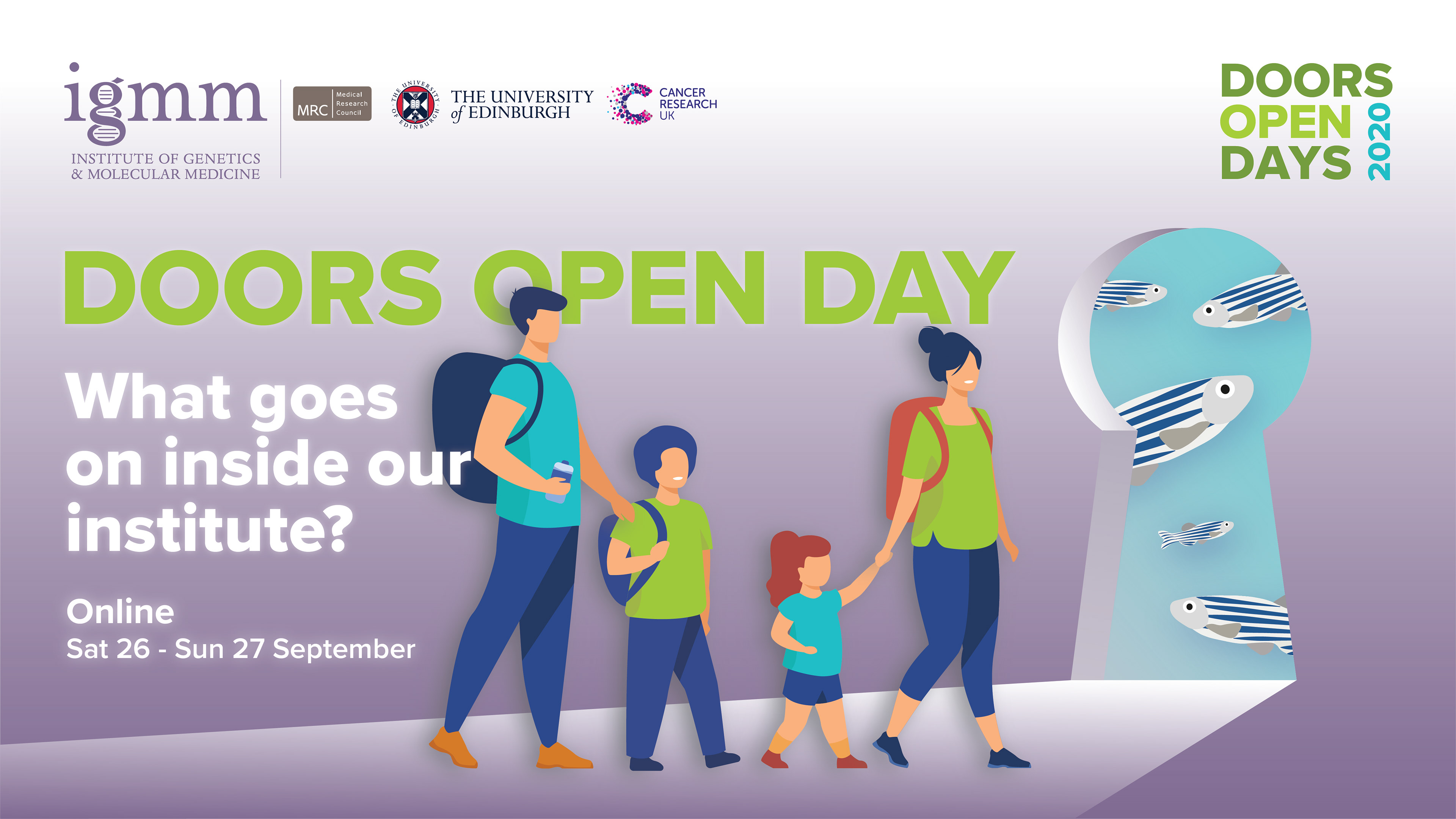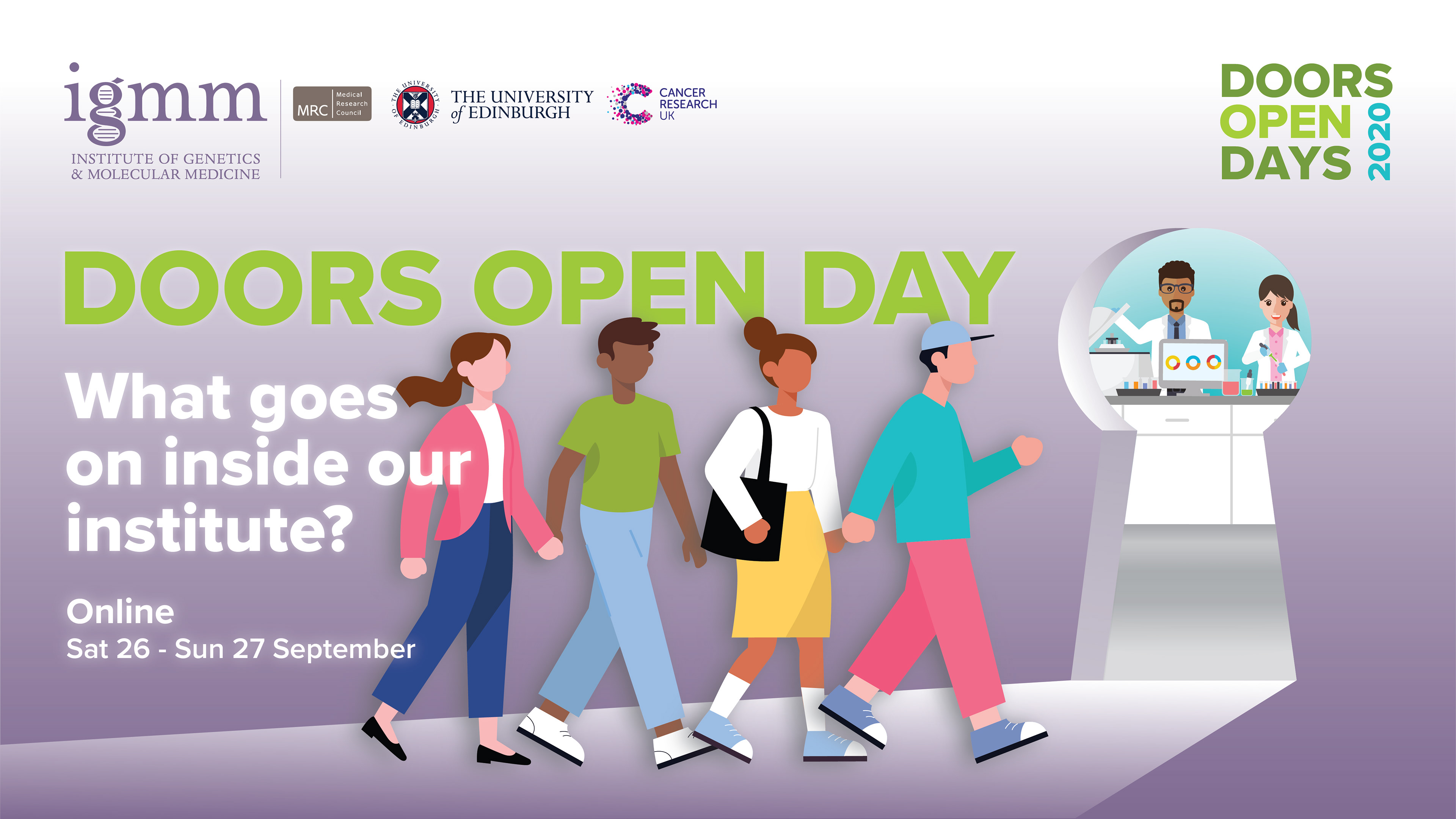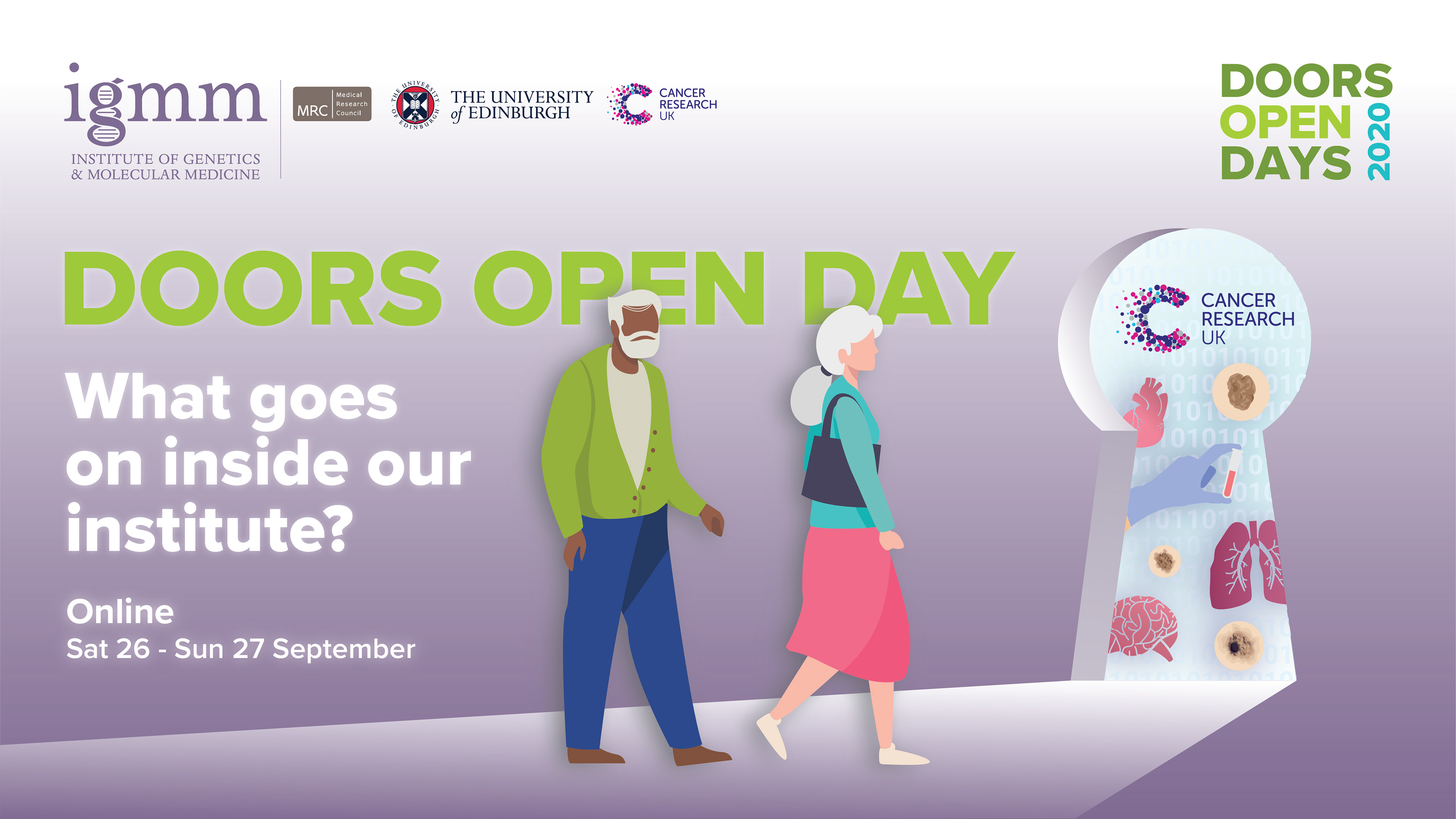 Concept: 'Through the keyhole' As everyone was in lockdown in 2020, I created a series of social media banners based around looking through a keyhole. The banners advertised an online version of the Doors Open Day event, where the public could get a glimpse of what goes on within the institute sat at a safe distance behind their computer, phone or tablet.